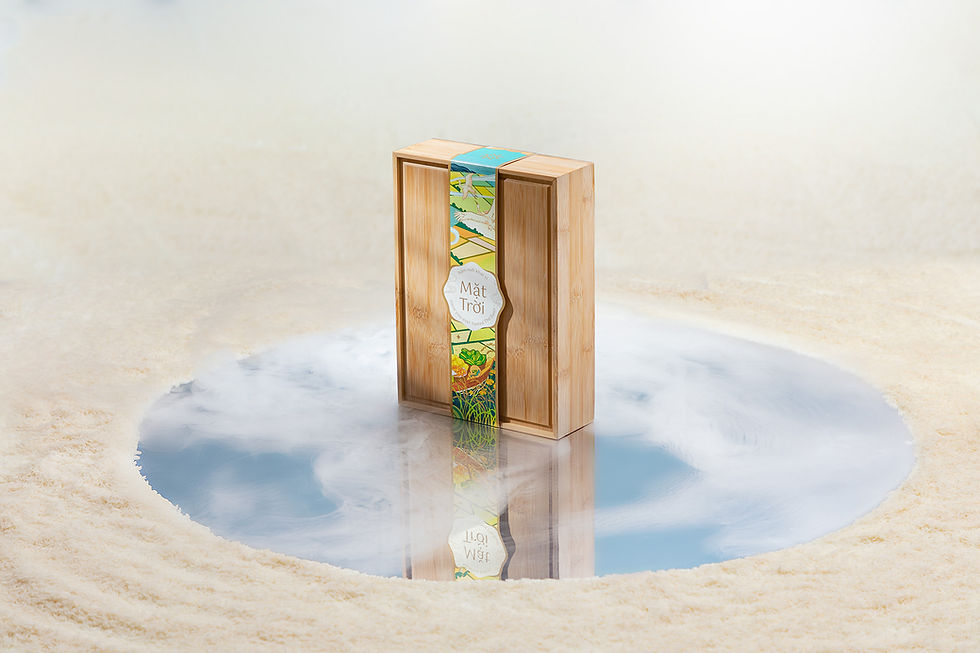 Người nhận món quà là một trong những người đầu tiên đón nhận ánh sáng ngon thơm ấy, trong một chiếc hộp tre thân thương, bọc trong những sắc màu trẻ sáng tạo trên cánh đồng truyền thống.